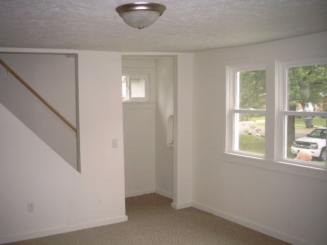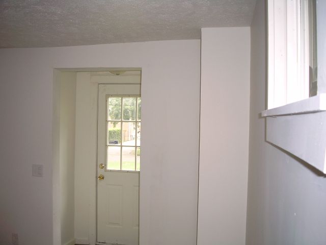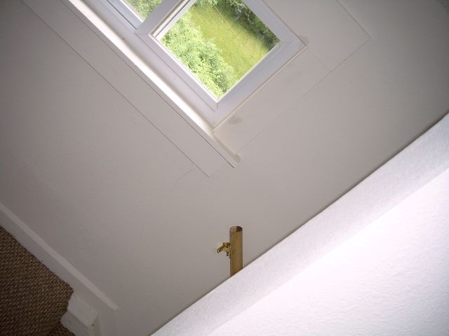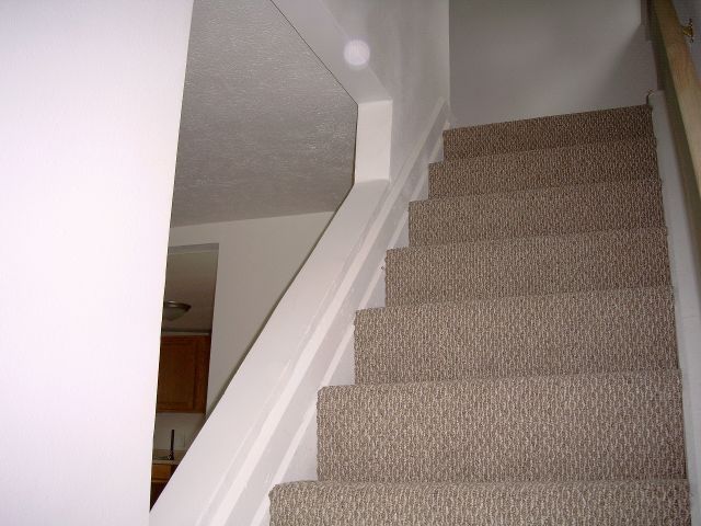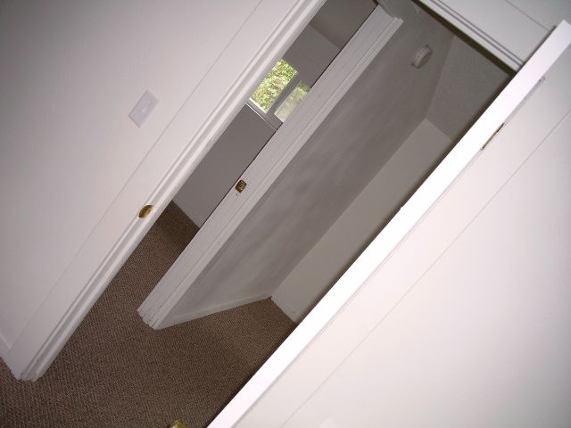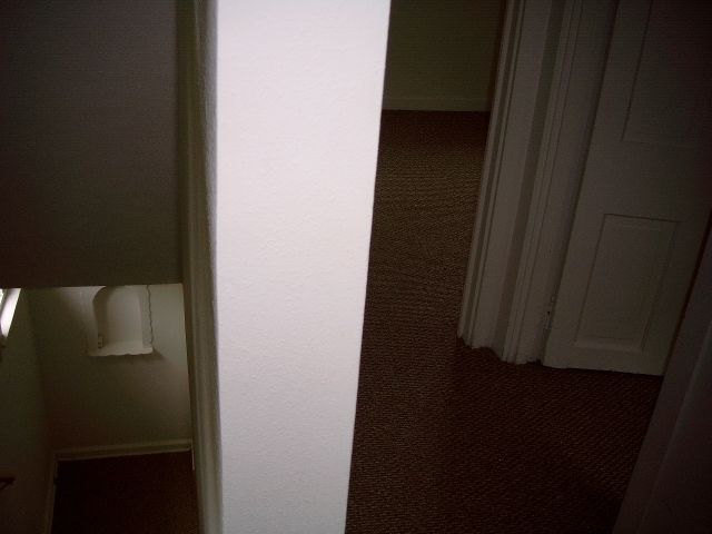 top of stairs, phone station at bottom, hall to bedrooms on right